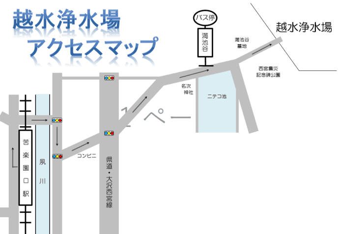 越水浄水場には駐車場はありませんので、公共交通機関をご利用ください〜