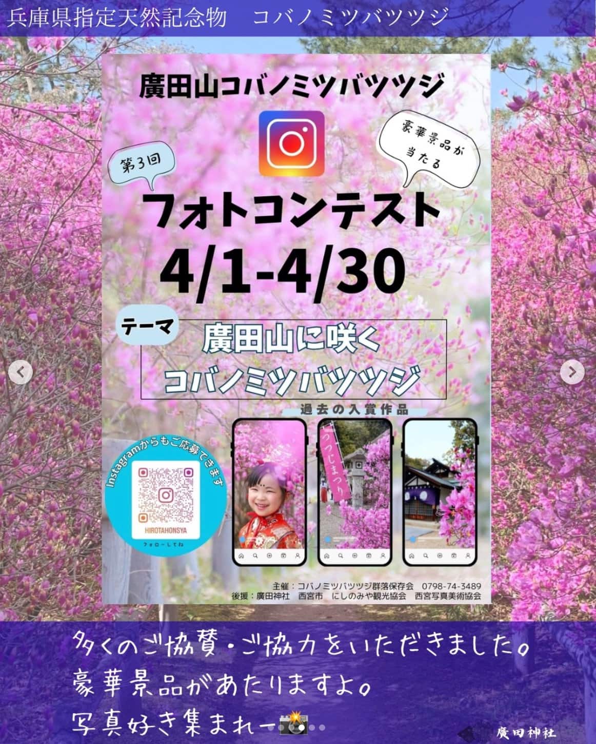 スマホなどで撮ったコバノミツバツツジの写真を、廣田神社 公式InstagramにDMで送って応募。入選すると豪華景品が当たるそうです。写真がカッコよく撮れたという方は、トライしてみてもいいかも〜。詳細はこちら