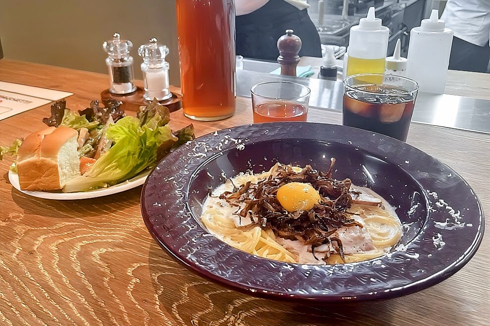 婦木農場(兵庫県丹波市)のこだわり卵とオニオンチップで『フレッシュカルボナーラ』スパゲッティ