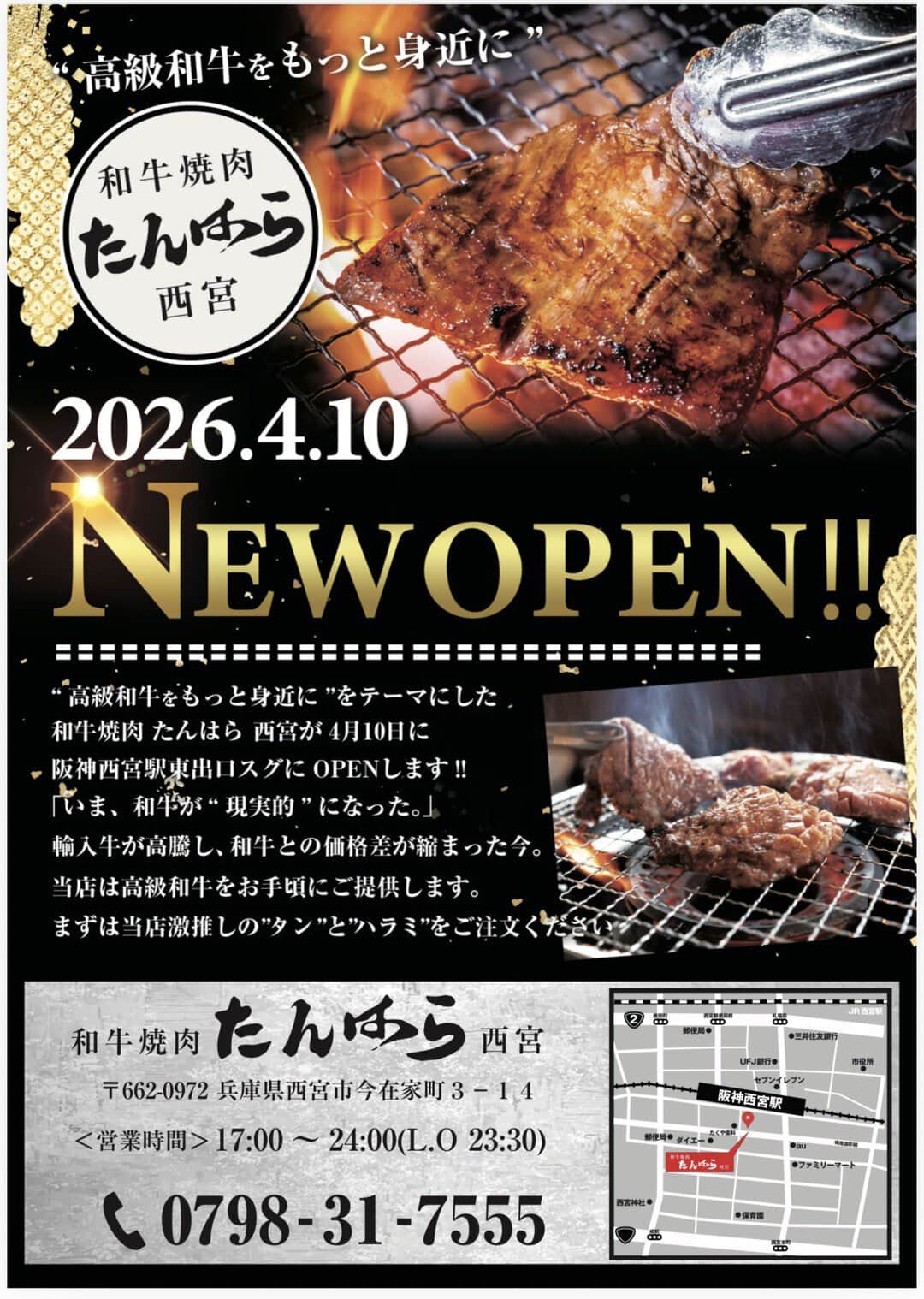 本日オープンする、鳴尾御影線沿い阪神西宮駅近くの「和牛焼肉たんはら」がメニューを見せてもらいましたので、お見せします〜