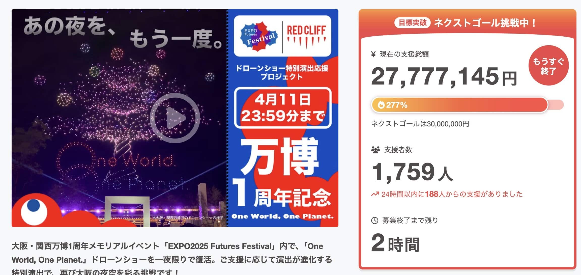 クラファンは終了まであと2時間時点で、目標の1000万円を大幅に超えて2,700万円を突破!