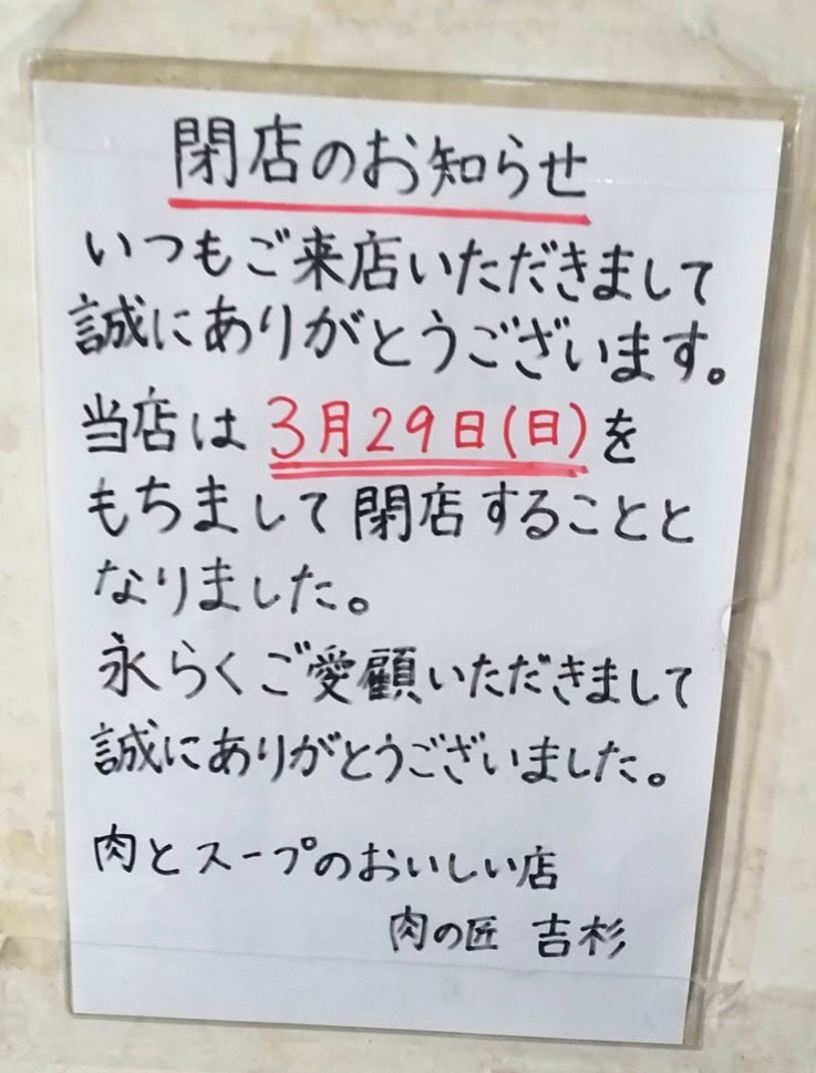 小曽根線沿い里中町の焼肉店「肉とスープの美味しいお店 肉の匠 吉杉」が閉店しています。