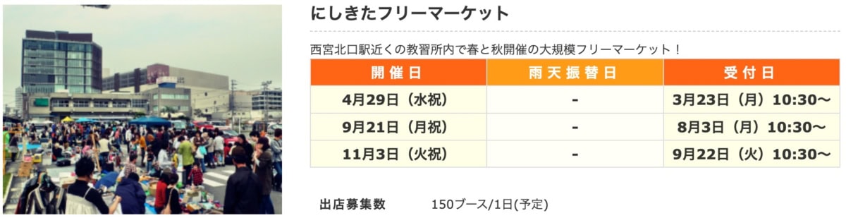 4月29日(水・祝)、西宮ガーデンズ前にある兵庫県自動車学校教習コース内で「にしきたフリーマーケット」が開催されるようです。