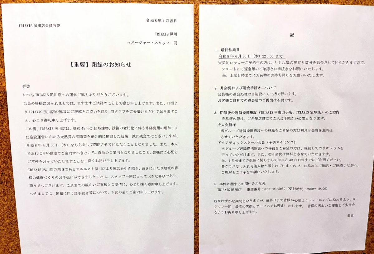 国道2号線ぞい神楽町にあるスポーツクラブ「トライアクシス夙川」が閉館するようです。