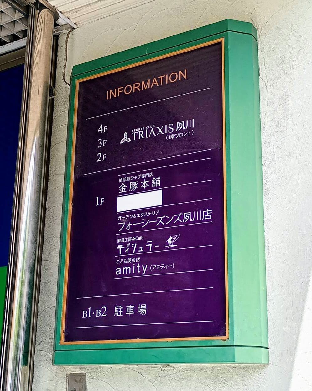 2階〜4階にトライアクシスが入っています。今はもうない金豚本舗やティシュラーも書かれたままですね〜