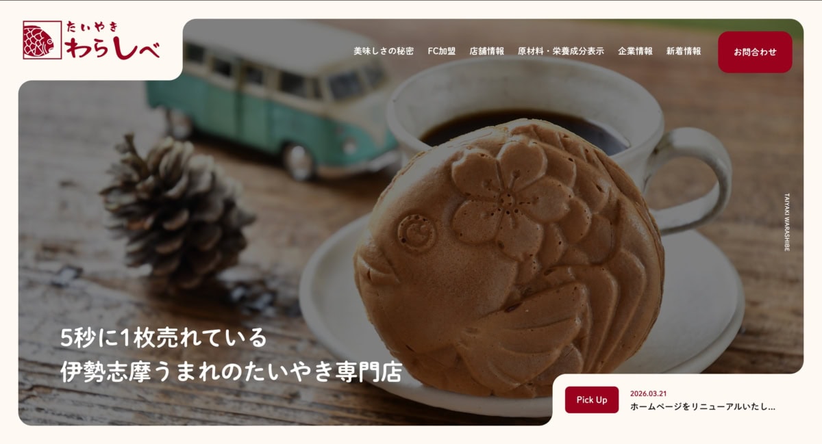三重・伊勢志摩発の鯛焼き専門店「たいやき わらしべ」。三重県産小麦「あやひかり」を使った、独特のモチモチ食感が楽しめるたい焼きのようです。