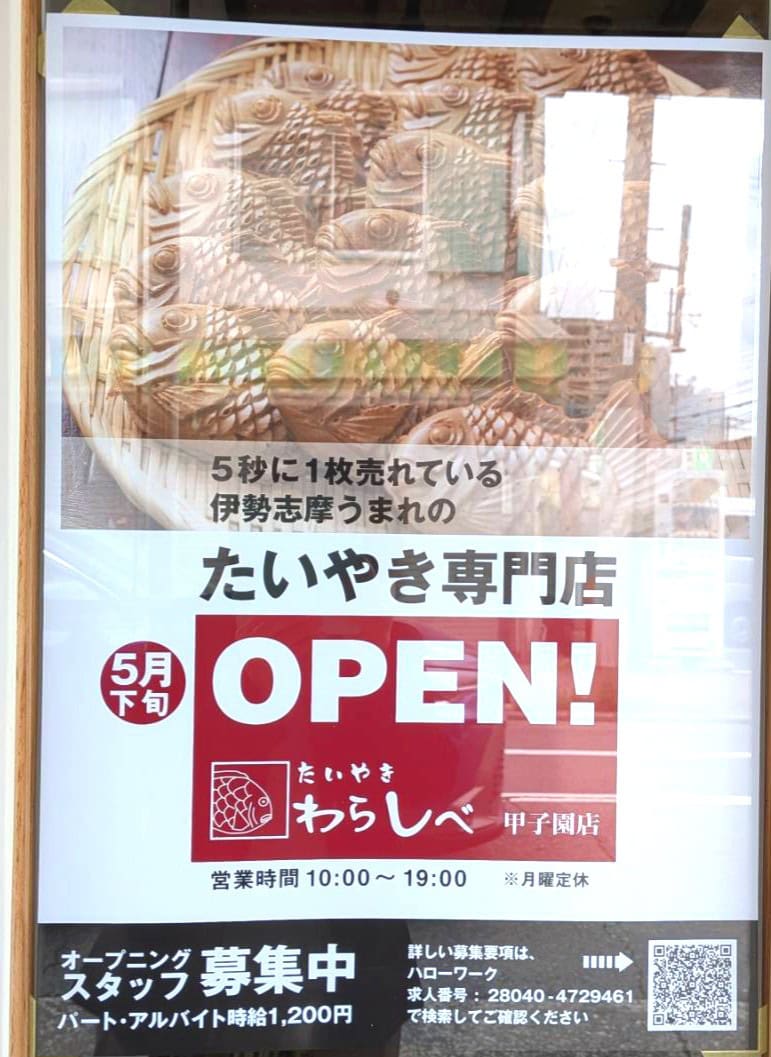 甲子園網引町、新甲子園商店街に「たいやき わらしべ」ができるようです。