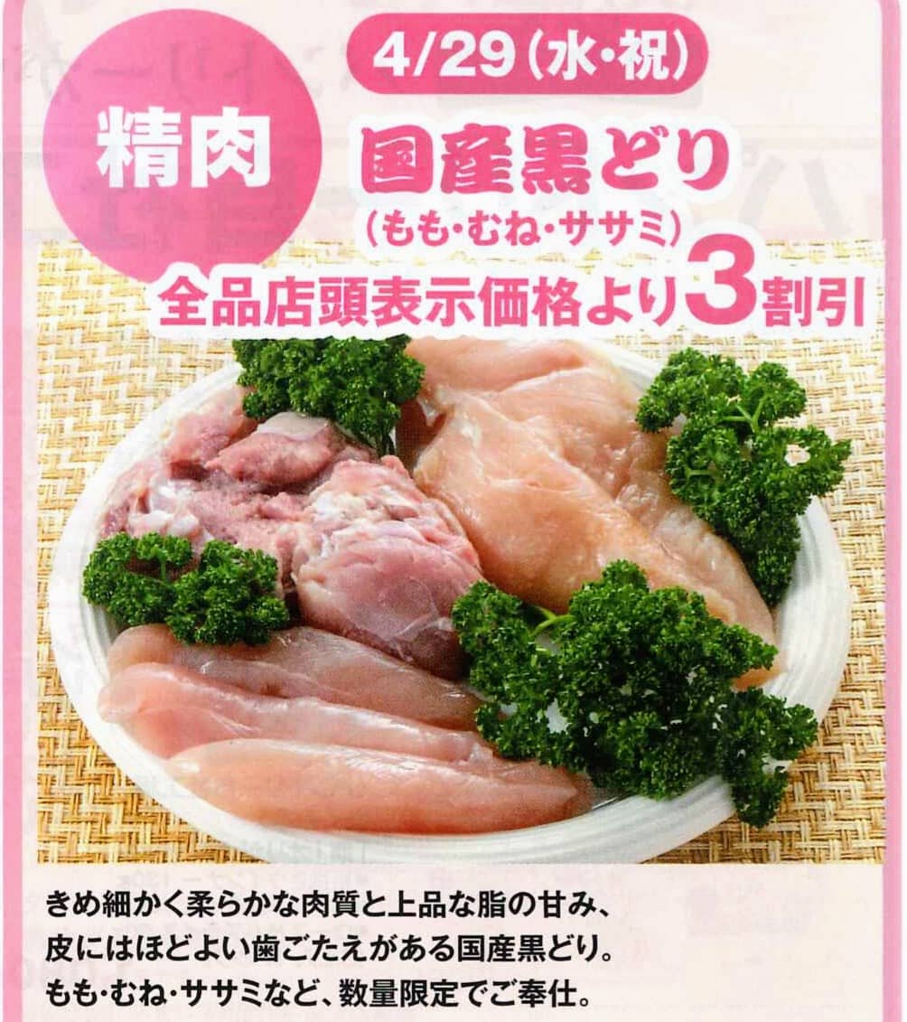 4/29(水・祝)国産黒どり(もも・むね・ササミ)が全品店頭表示価格より3割引