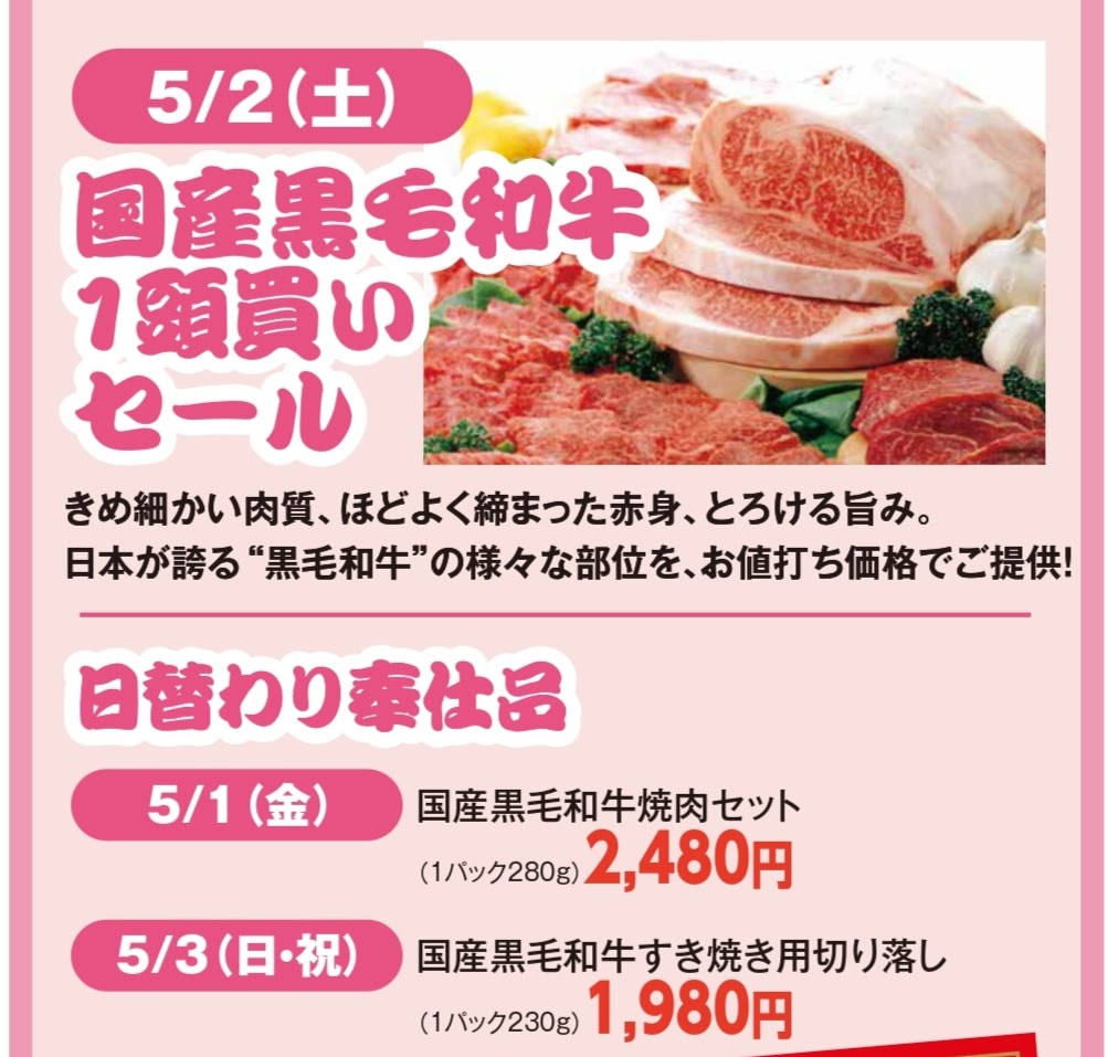 5/2(土)国産黒毛和牛1頭買いセール!日本が誇る黒毛和牛のいろんな部位がお値打ちで並びます〜きめ細かい肉質、ほどよく締まった赤身、とろける旨み・・・