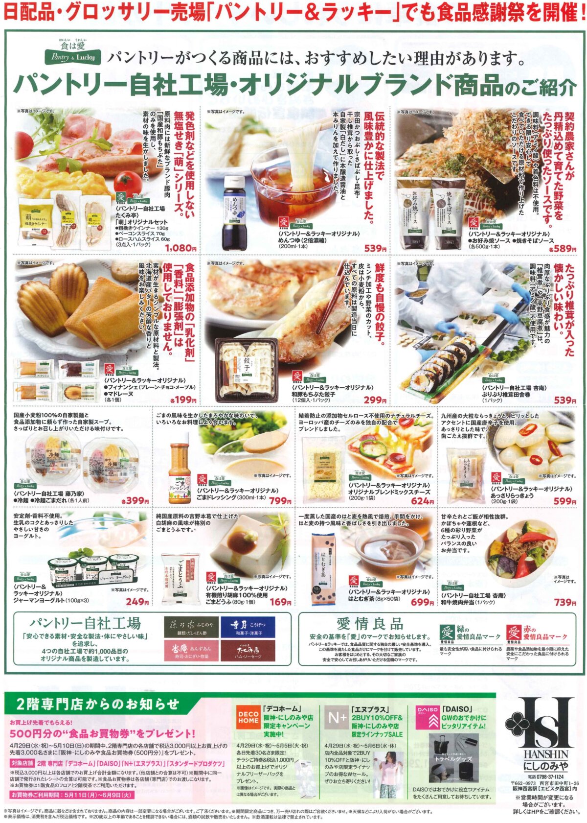 4月29日(水・祝)〜5月10日(日)の期間中、対象店舗で税込3,000円以上お買上げの先着3,000名さまに『阪神・にしのみや食品お買物券(500円分)』をプレゼント!