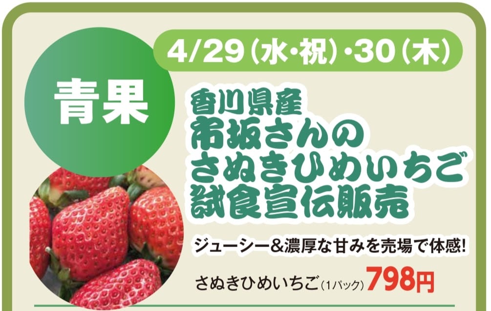 4/29(水・祝)・30(木)香川県産 市坂さんのさぬきひめいちご試食できます〜(1パック798円ジューシー&濃厚な甘みを売場で体感!