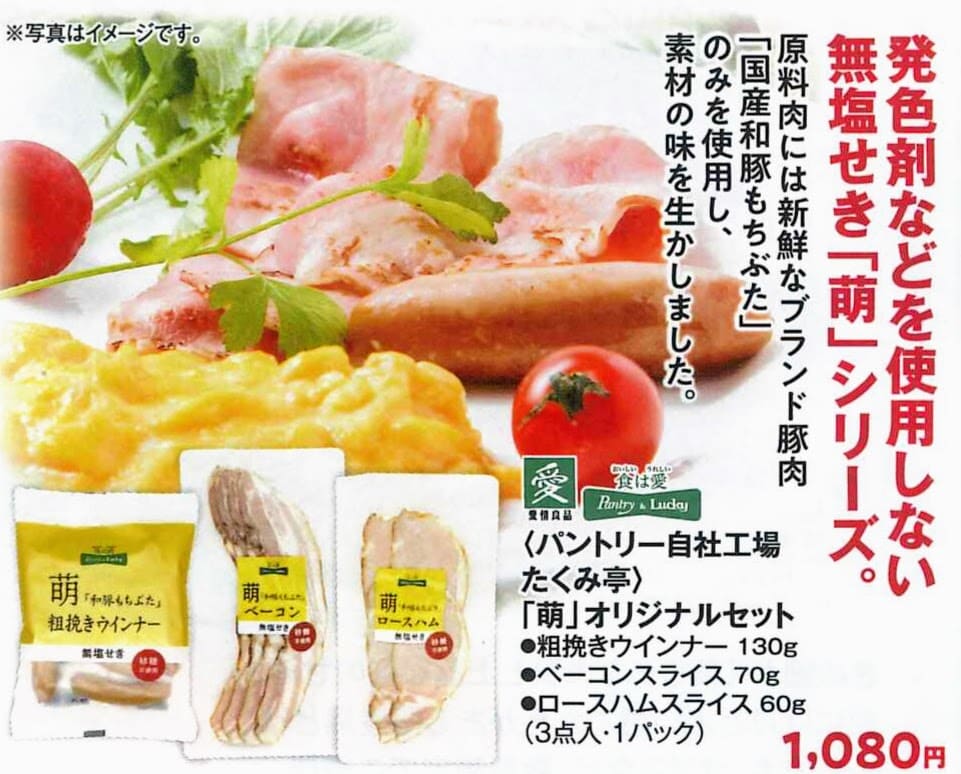 このウインナーやハムの色がピンクじゃないのは「無塩せき(むえんせき)」といって、発色剤を使用せずに塩漬けする製法だからだそうな。お肉本来の味がダイレクトに感じられるんだとか!緑色のってついてる商品は安心・安全・こだわりを大事にした商品のしるしとのこと