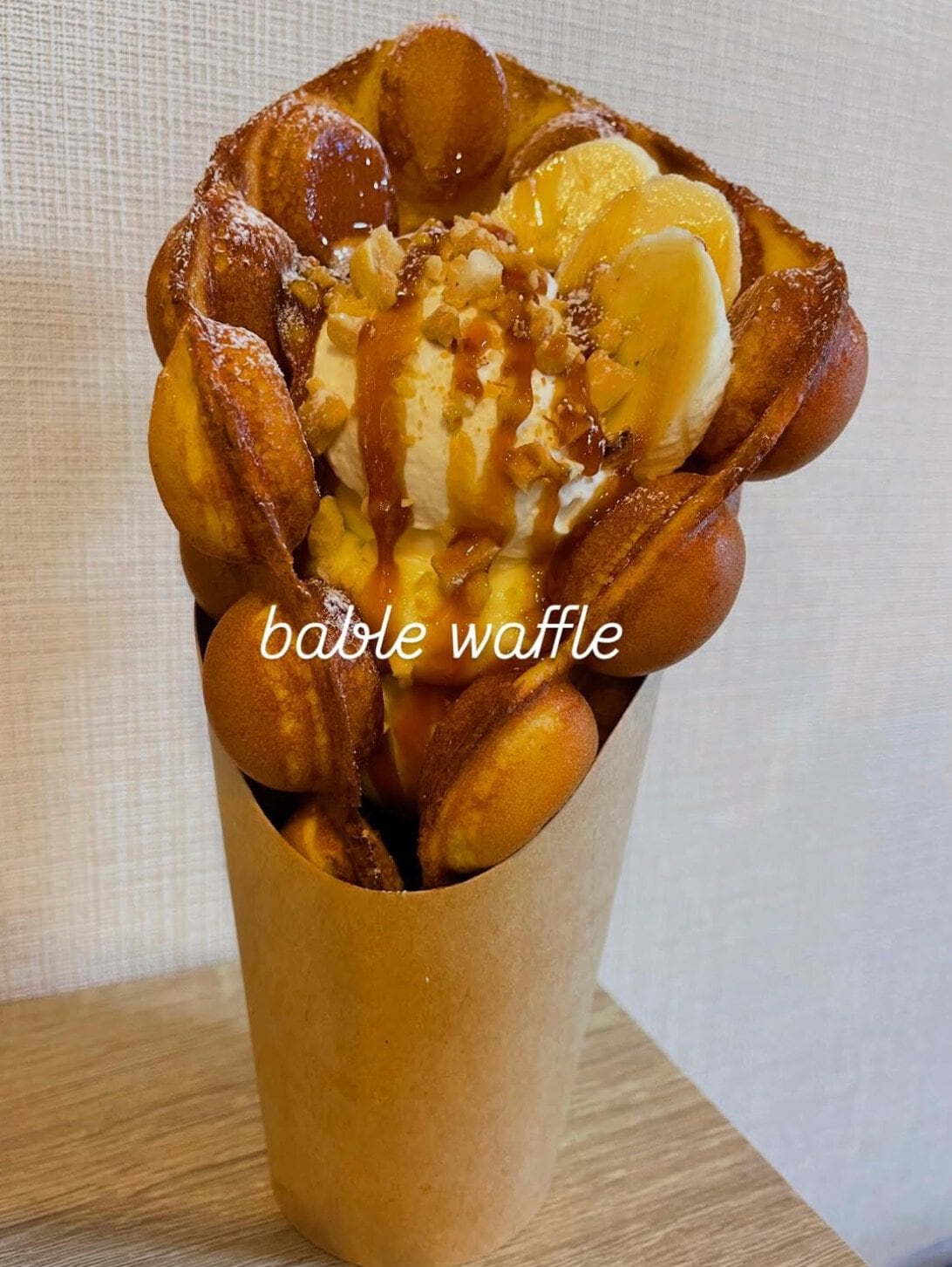 こちらは「バブルワッフル(キャラメルナッツフレーバー)」ってメニュー。パフェみたい、映える〜♡イチゴ味とチョコ味もあるとのこと。
