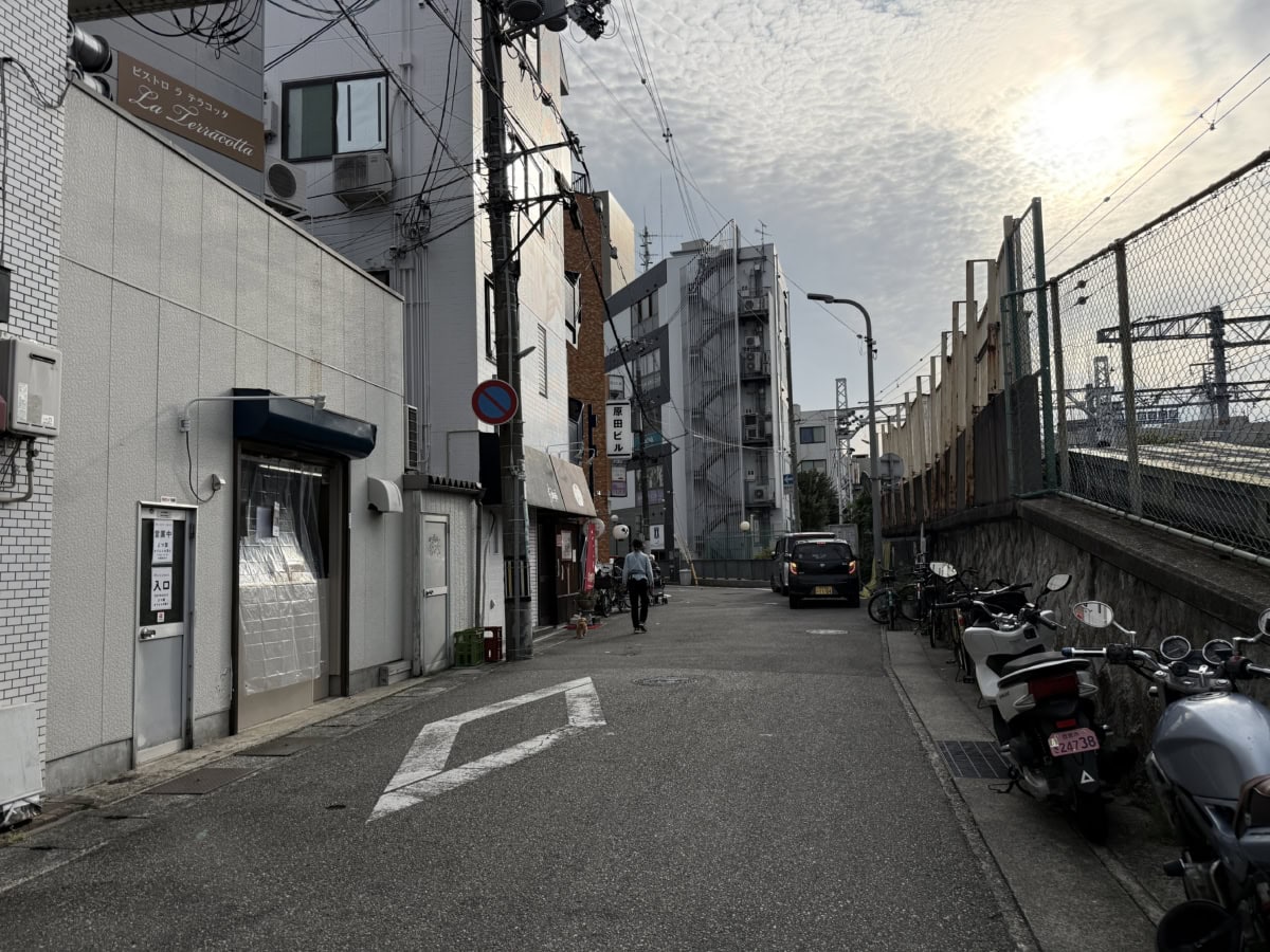 反対方向へ行くと、窯焼ピッツァ&肉バル ビステッカ、焼肉 穐田などがあり、西宮車庫の横を通って中津浜線へ。