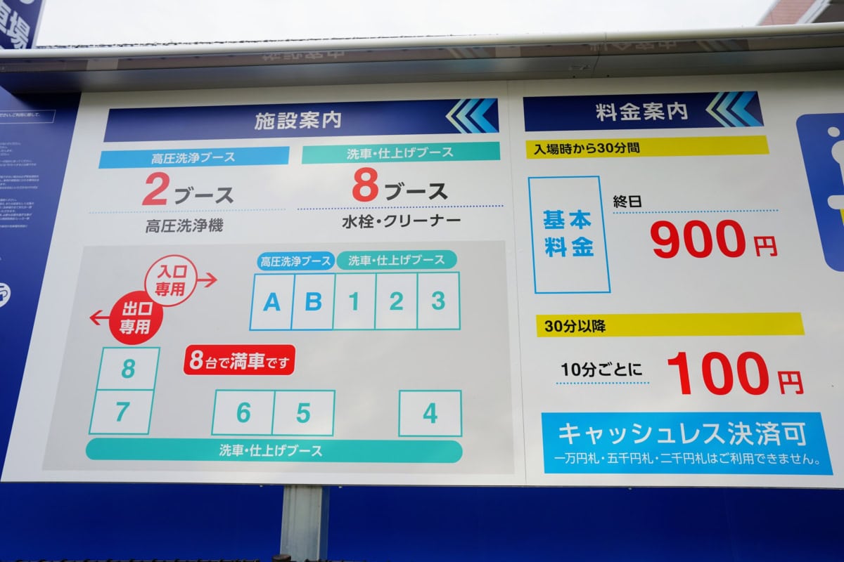 30分900円。30分以降は10分ごとに100円。施設は高圧洗浄ブース2台と洗車・仕上げブース8台の合計10台。