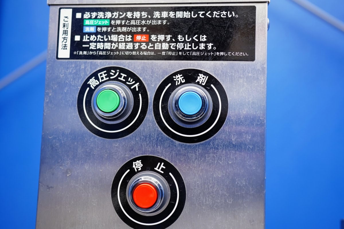 ボタンは高圧ジェット(緑)と洗剤(青)と停止(赤)の3つだけ。
