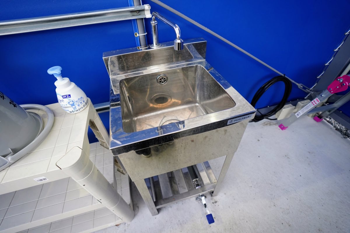 ペダル式シンクも完備!汚れた手も洗えるし、雑巾も流せる〜ハンドソープまで置いてあった、神